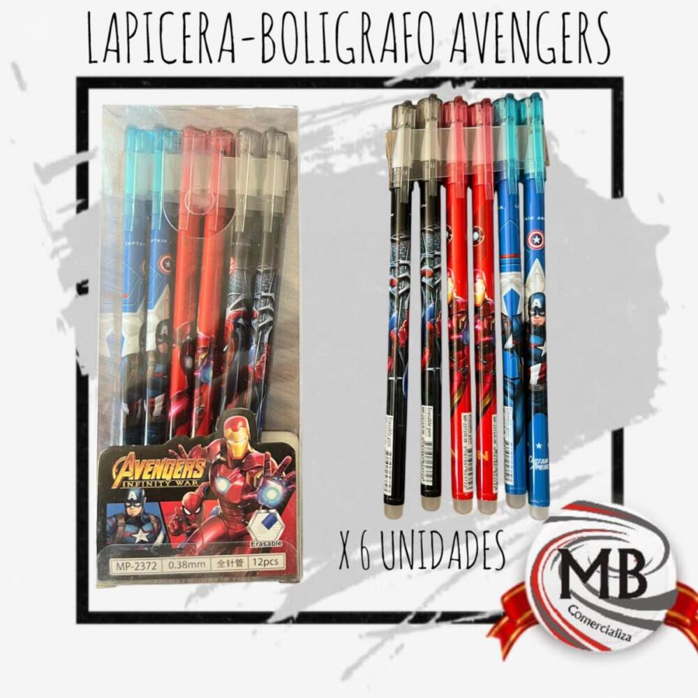 ​"Pack de 6 bolígrafos borrables con diseños de superhéroes y trazo de 0.38mm. Set de escritura creativa ideal para venta por mayor en Argentina a través de MB Comercializa."